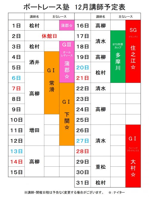 12月6日(土)~ 「ボートレース」「競輪」 12月14日(日)~ 「オリジナル」 ボートレース 無料(おひとり様1部限り) 競輪 ※終了しました 競輪予想紙をご購入の方 オリジナル ※終了しました 無料(おひとり様1セット限り) ※各カレンダー無くなり次第終了となりますのでお早めにご来場ください |